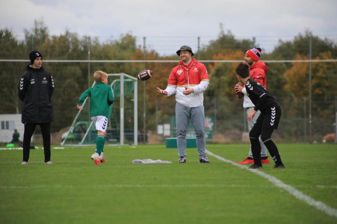 Football an der Lohmühle ist - trotz mehrfacher Ausflüge der Lübeck Cougars hierher - immer noch etwas besonderes. Schließlich ist es das Revier der Drittliga-Kicker vom VfB Lübeck sowie deren Jugendmannschaften. Aber die D-Junioren hatten nach einer außergewöhnlichen Trainingseinheit gefragt - und sie prompt bekommen. Herbert Mette und Eric Schlomm, einst selbst Torhüter beim VfB, zeigten den Kids am Mittwochabend die Football-Basics. Ihnen sollten auch mal ungewohnte Bewegungsmuster vermittelt werden. "Die Zusammenarbeit hat sehr viel Spaß gemacht und ich würde mich freuen, wenn wir so etwas bald wiederholen könnten", sagt Mette. Nach anfänglichen kleineren Berührungsängsten hätten die Jungs richtig losgelegt. Eine Wiederholung scheint also nicht ausgeschlossen.